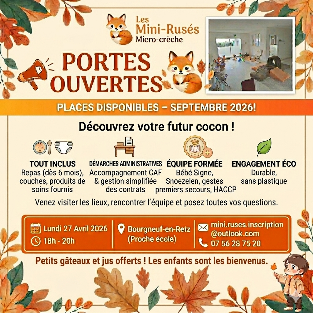 Nous organisons une soirée Portes Ouvertes le lundi 27 Avril 2026 de 18h à 20h pour faire découvrir cette structure et ses places disponibles pour la rentrée de septembre 2026.